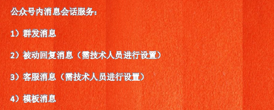 公眾號(hào)是以微信用戶的一個(gè)聯(lián)系人形式存在的,消息會(huì)話是公眾號(hào)與用戶交互的基礎(chǔ)。目前公眾號(hào)內(nèi)主要有這樣幾類消息服務(wù)的類型,分別用于不同的場(chǎng)景。
