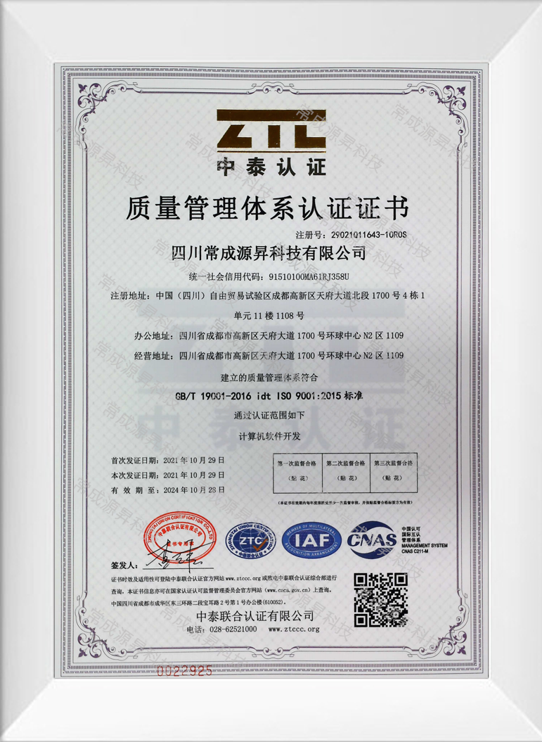 經成都APP開發公司-源昇科技的不懈努力之下,2021年10月取得:質量管理體系認證證書(IS9001:2015標準)。